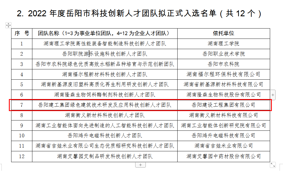 12月19日,2022年度岳陽市科技創(chuàng)新人才團隊擬正式入選名單公布,岳陽建工集團由總工程師周一波牽頭的“綠色建筑技術(shù)研發(fā)應(yīng)用科技創(chuàng)新人才團隊”入選。