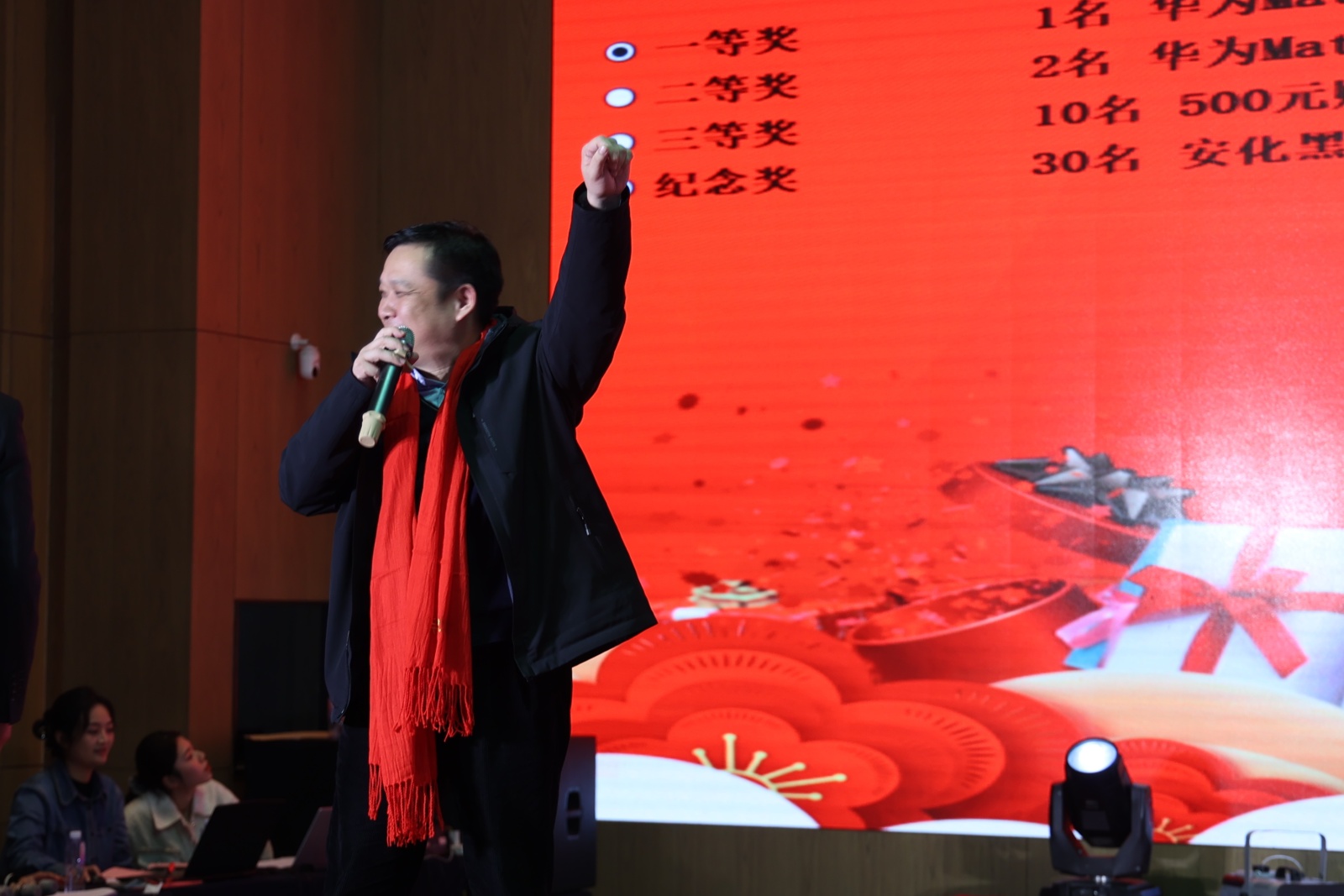 隨后,全體人員歡聚一堂,觀看了由公司員工組織的文藝匯演。 伴隨著鼓舞的熱鬧開場,2024年新春年會文藝匯演在歡樂的氛圍中正式拉開帷幕。整臺晚會內容豐富,精彩紛呈,歌曲、舞蹈等一個個節(jié)目銜接緊湊,燈光、音響配合完美。最激動人心的是穿插在節(jié)目表演過程中一、二、三等獎及紀念獎的抽取活動,將現(xiàn)場氣氛一次次推向高潮,幸運的員工獲得了公司精心準備的華為手機、購物卡、安化黑茶、紅包雨等禮物。整個現(xiàn)場氣氛熱烈、歡快,大家頻頻舉杯,相互祝愿。